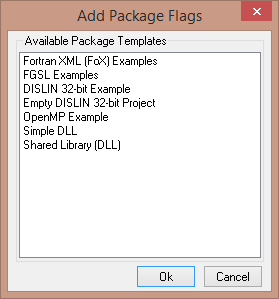 The user can select one or more package templates listed from the list. Multiple selections can be made while holding down the Control key. If the user then presses Ok, the flags necessary to use the selected packages will be added to the Fortran Compiler, C Compiler, and Linker Flags for the current project.