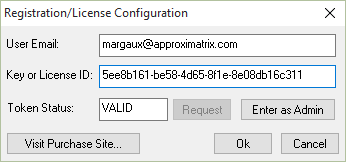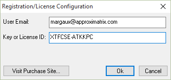An Individual License is a combination of an email address and registration key, normally of the form XXXXXX-XXXXXXX (The lengths of the two character sequences can vary between 5 and 7 letters). In the Registration/License Configuration window, you would enter your license details as shown below: